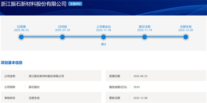 华夏能源网&零碳资本论获悉,12月5日,浙江振石新材料股份有限公司(以下简称“振石股份”)走完IPO前的最后一道流程——注册生效,下一步公司将在上交所挂牌上市。