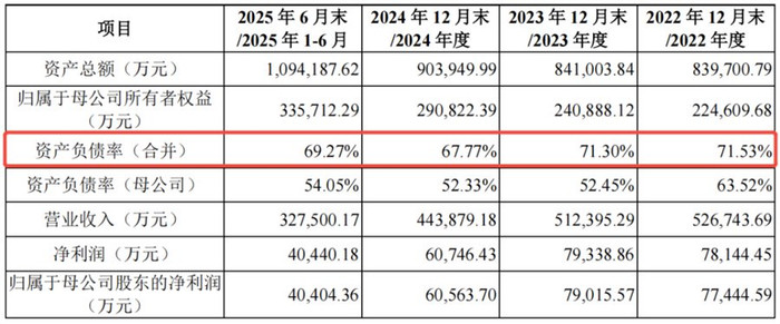 大额分红带来的直接后果,是公司资金缺口扩大,负债规模飙升——2022年到2025年上半年,振石股份资产负债率分别为71.53%、71.3%、67.77%和69.27%。长期在70%左右徘徊,显著高于A股制造业企业平均资产负债率水平。截至2025年上半年,振石股份的有息负债已达52.99亿,其货币资金仅14.89亿。